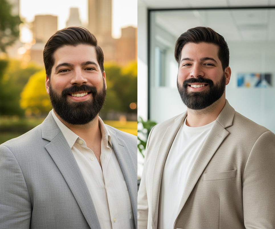 Retrato profesional de [hombre / mujer] con traje o blazer casual elegante, fondo de oficina moderna o coworking, iluminación suave con tono cálido, cámara [Sony Alpha 7R IV], estilo [emprendedor / corporativo moderno], pose segura y natural — realismo 8K.