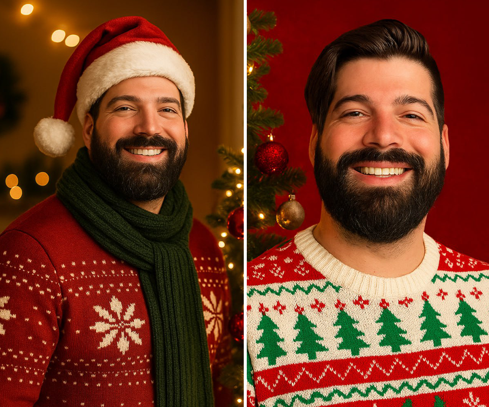 Hazme un retrato navideño de un hombre con barba ligera y sonrisa natural, usando un suéter de renos. Añade un fondo con efecto bokeh de luces doradas y una ligera nevada simulada para dar ese toque invernal elegante y cinematográfico.