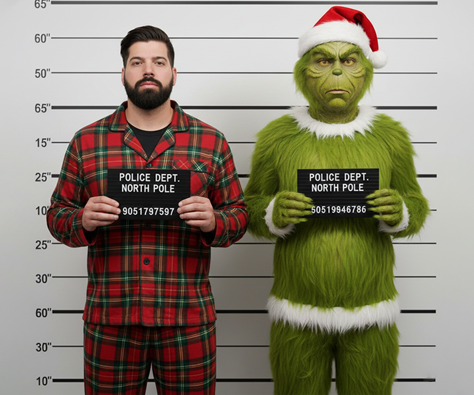 Retrato fotográfico estilo mugshot policial cinematográfico con temática navideña. La escena muestra a dos personajes de pie frente a una pared blanca con líneas horizontales, típica de una comisaría, creando una composición simétrica y frontal. El encuadre es vertical, en plano medio, con la cámara situada a la altura del pecho y alineada directamente al rostro de los sujetos. El sujeto principal debe recrear fielmente el rostro, complexión, tono de piel y rasgos faciales de la persona a partir de la foto de referencia proporcionada, manteniendo una similitud máxima y un realismo fotográfico alto. La expresión facial es seria y neutral, con mirada directa a la cámara, postura rígida y hombros rectos, sin sonreír, evocando una auténtica fotografía policial. La vestimenta tiene un enfoque navideño. La persona humana lleva un pijama de cuadros rojos y verdes con textura realista de tela. A su lado aparece un segundo personaje caracterizado como monstruo verde navideño con pelaje, con un traje peludo verde hiperrealista, pelaje detallado y voluminoso, máscara facial expresiva y un gorro clásico de Santa Claus rojo con borde blanco. Ambos personajes sostienen una placa negra tipo mugshot con texto blanco, de apariencia auténtica, que incluye información policial ficticia como “POLICE DEPT. NORTH POLE” y un número de registro, reforzando el tono humorístico pero realista de la escena. La iluminación es de estudio, frontal y suave, con sombras mínimas y balance de luz uniforme, similar a una fotografía policial profesional. La imagen presenta alto rango dinámico, colores bien equilibrados y contraste moderado, destacando los rojos navideños, el verde vibrante del traje del monstruo navideño con pelaje y los blancos limpios del fondo. El estilo visual es ultra realista y cinematográfico, con enfoque nítido, textura natural de la piel, detalles finos en la tela y el pelaje, calidad editorial y resolución muy alta. Se utiliza una lente de 50mm, profundidad de campo baja, fondo ligeramente desenfocado, ISO bajo y calidad tipo 8K, combinando humor, ironía y una estética navideña oscura y elegante.