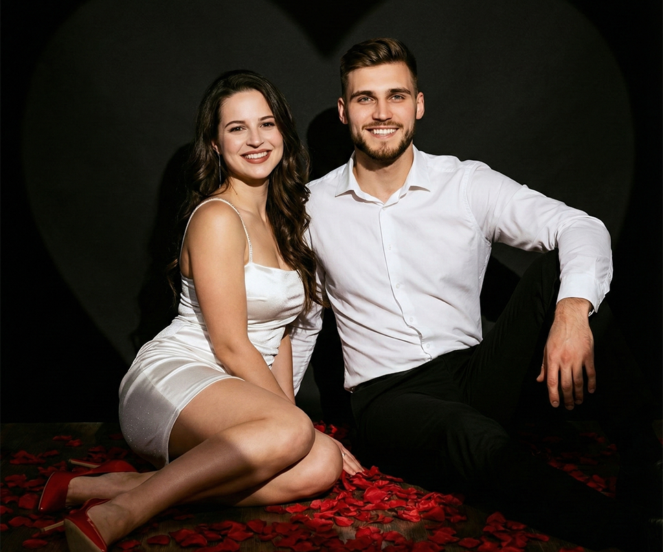 Esta es mi cara y la de él, sin cambiar sus rasgos faciales. Haz una sesión de fotos con ellos sentados en el piso, mirando al frente y sonriendo, con pétalos rojos en el suelo y una sombra de corazón en la espalda. Ella usa un mini vestido de seda blanco ajustado con brillo, mangas finas, tacones rojos y cabello largo ondulado. Él viste camisa blanca y pantalones negros. Fondo negro, iluminación dramática, estilo editorial de revista, ultra realista, muy detallado. Proporción 4:4.