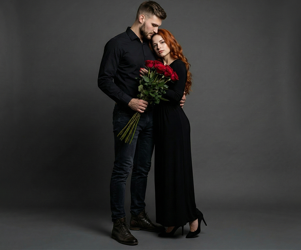 Edita las fotos en un retrato profesional de estudio de una pareja ligeramente abrazada. Sin cambios en los rostros, mujer baja de cabello ondulado pelirrojo con vestido largo negro y tacones, hombre alto y robusto con jeans oscuros, camisa negra de manga larga y botas, sosteniendo un ramo de rosas rojas. Iluminación suave y mínima, sombras firmes, atmósfera seria, pose relajada, él mirando a ella, fondo liso, estética moderna, HD.