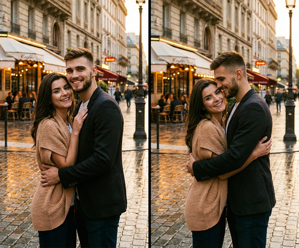 Genera un retrato de pareja de A y B en una calle de París al atardecer. Mantener los rostros de A y B intactos, sin alteraciones, tal como aparecen en las imágenes originales. Adoquines mojados reflejando la luz de los cafés, brillo suave de la calle, retrato ambiental 35 mm, contraste cinematográfico, ambiente auténtico de viaje. Sin texto legible en los carteles del fondo.