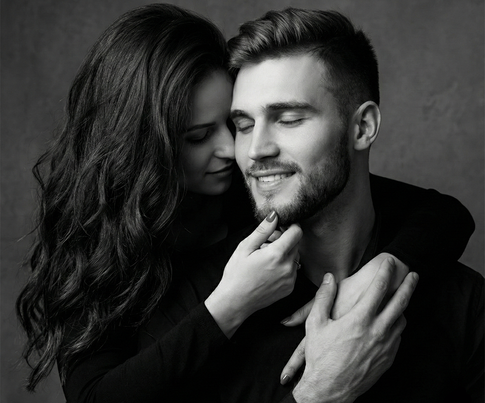 Crea un retrato artístico en blanco y negro de una pareja en estudio, en pose íntima. Él ligeramente al frente, ojos cerrados, sonrisa serena; ella detrás, apoyando su rostro cerca del suyo, abrazándolo con ternura. Su cabello largo y ondulado enmarca ambos rostros. Manos visibles con detalle elegante. Ropa oscura lisa, iluminación suave difusa desde arriba y lateral, fondo gris oscuro, estilo cinematográfico, enfoque en rostros y manos, profundidad de campo baja, atmósfera emocional y atemporal.