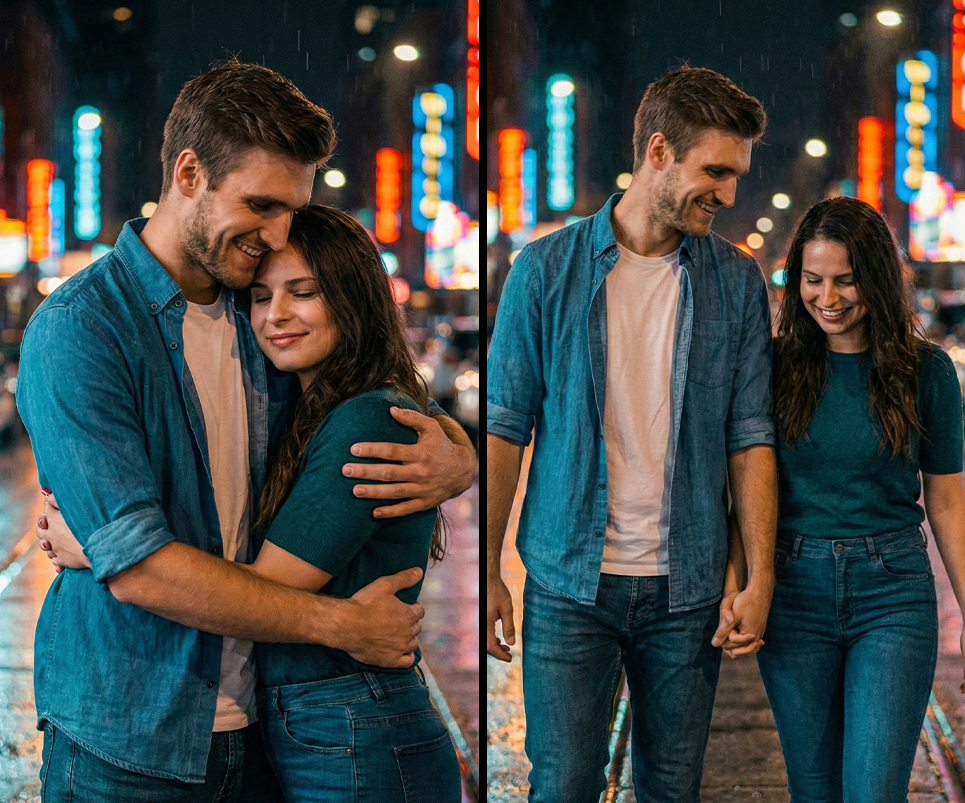 Crea un retrato cinematográfico nocturno de pareja combinando A y B. No modificar los rostros de A ni B, preservarlos exactamente como en las imágenes originales. Fondo con bokeh de luces de neón y reflejos de lluvia en el asfalto. Iluminación principal suave desde el lado izquierdo. Toma con lente de retrato 85 mm, gradación de color teal y naranja, textura de grano de película, con un ambiente romántico y atmosférico.