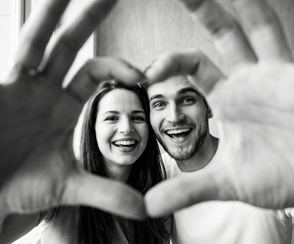 Crea un retrato fotográfico en blanco y negro de una pareja sonriendo. Sus manos, en primer plano y desenfocadas, forman un marco en forma de corazón. La pareja está en el centro, con expresiones genuinas de alegría y sorpresa. Iluminación suave y natural. Estilo de fotografía de compromiso, espontáneo y romántico. Mantener los rasgos faciales, no cambiar los rostros.