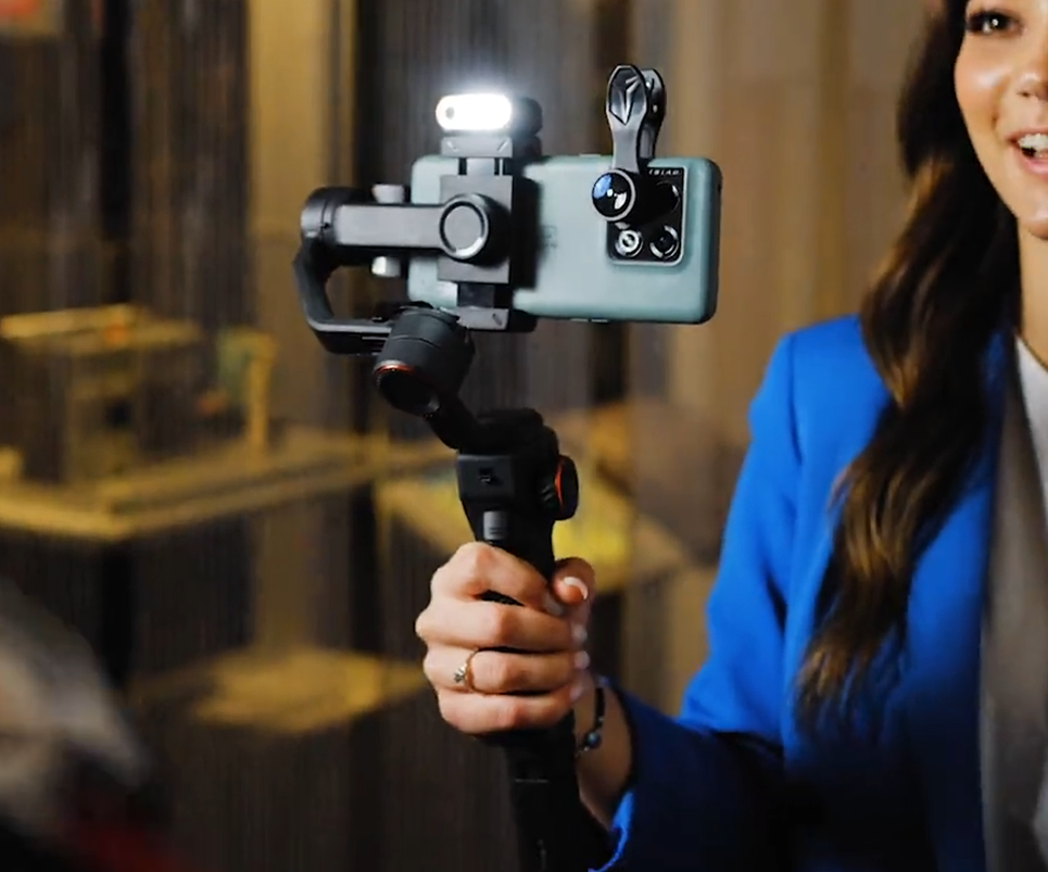 Persona grabándose con un celular montado en gimbal y luz LED encendida.