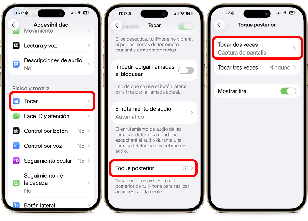 Esto es de las mejores funciones que he descubierto en mi iPhone. Puedes configurarlo para que, al dar dos toques en la parte trasera, haga una captura de pantalla. Es comodísimo y rápido, sin botones y sin tener que hacer malabares con las manos.