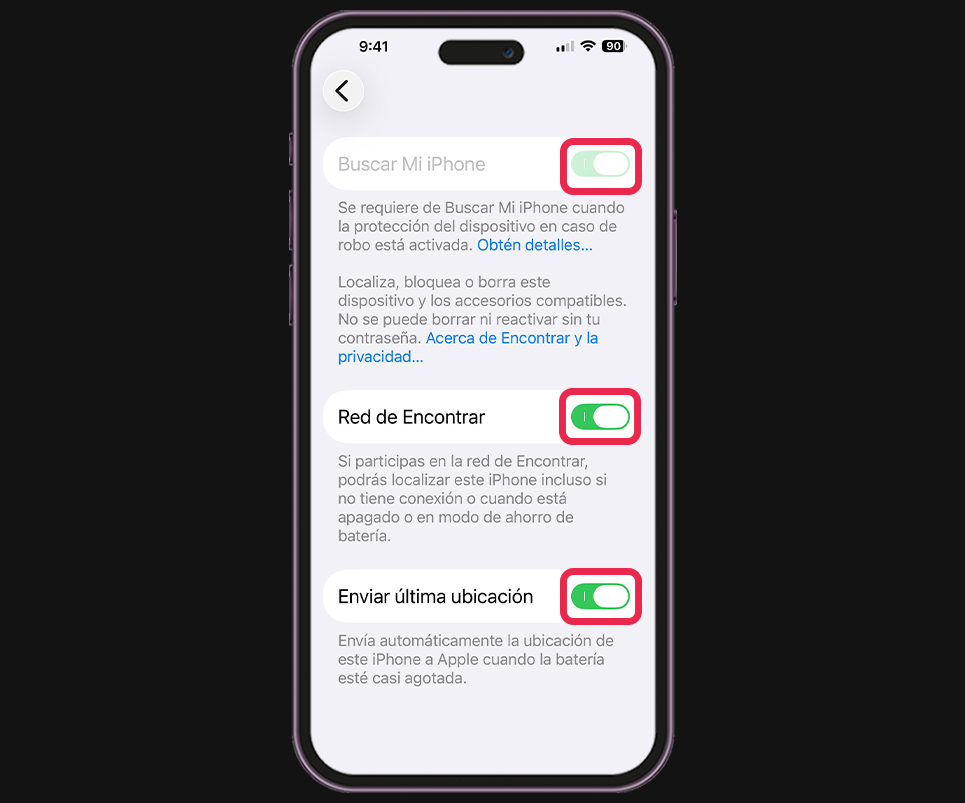 - Enviar última ubicación guarda automáticamente la posición del iPhone antes de que se quede sin batería.