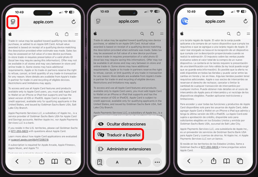 Solo abre la web en Safari, toca el botón aA que aparece en la barra de direcciones y selecciona “Traducir al español”. En segundos, el navegador traducirá todo el contenido automáticamente y podrás seguir navegando con normalidad.
